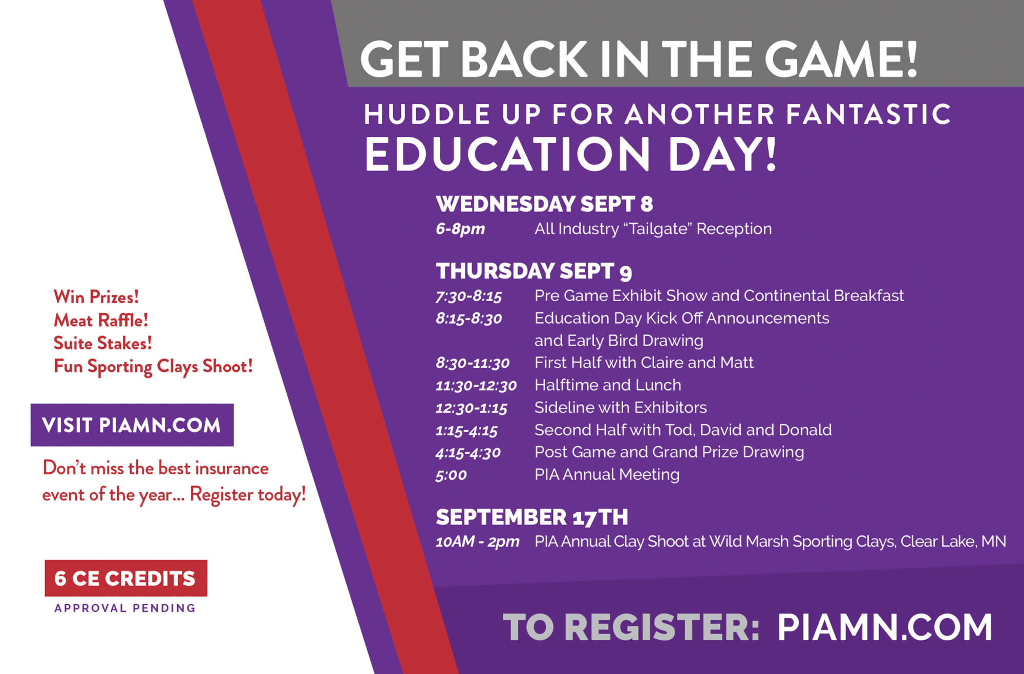 PIA Education Day is a great networking event and one of the best opportunities to connect with your industry peers! Join us at the Viking Lakes sports development complex in Eagan for our pre-game all-industry happy hour reception on September 8th! We will then Kick-off our Education Day and Trade Show on September 9th at Omni Viking Lakes Hotel, concluding with our post-game Sporting Clays on September 17th!